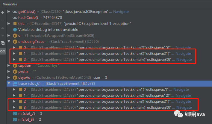 Connected to the target VM, address: '127.0.0.1:57353', transport: 'socket' java.lang.RuntimeException: level 3 exception at person.ismallboy.console.TestEx.fun3(TestEx.java:24) at person.ismallboy.console.TestEx.main(TestEx.java:30) Caused by: java.io.IOException: level 2 exception at person.ismallboy.console.TestEx.fun2(TestEx.java:15) at person.ismallboy.console.TestEx.fun3(TestEx.java:21) ... 1 more Caused by: java.io.IOException: level 1 exception at person.ismallboy.console.TestEx.fun1(TestEx.java:7) at person.ismallboy.console.TestEx.fun2(TestEx.java:12) ... 2 more Disconnected from the target VM, address: '127.0.0.1:57353', transport: 'socket'