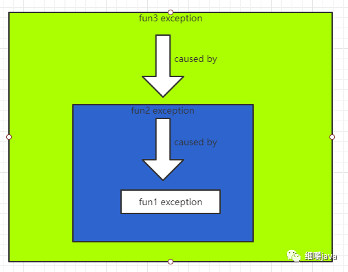 所以,Caused by(中文是“由...造成的”意思)也就比较好理解了,就是这个异常时由哪里触发的意思。fun3的异常是由fun2的异常触发的,而fun2的异常又是由fun1的异常触发的。