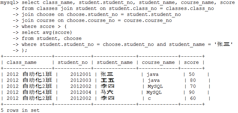 如果子查询返回单个值,则可以讲一个表达式的值与子查询的结果进行比较。 例如,检索成绩比学生张三平均分高的所有学生及课程的信息, 可以使用下面的SQL语句, 执行结果如下图。