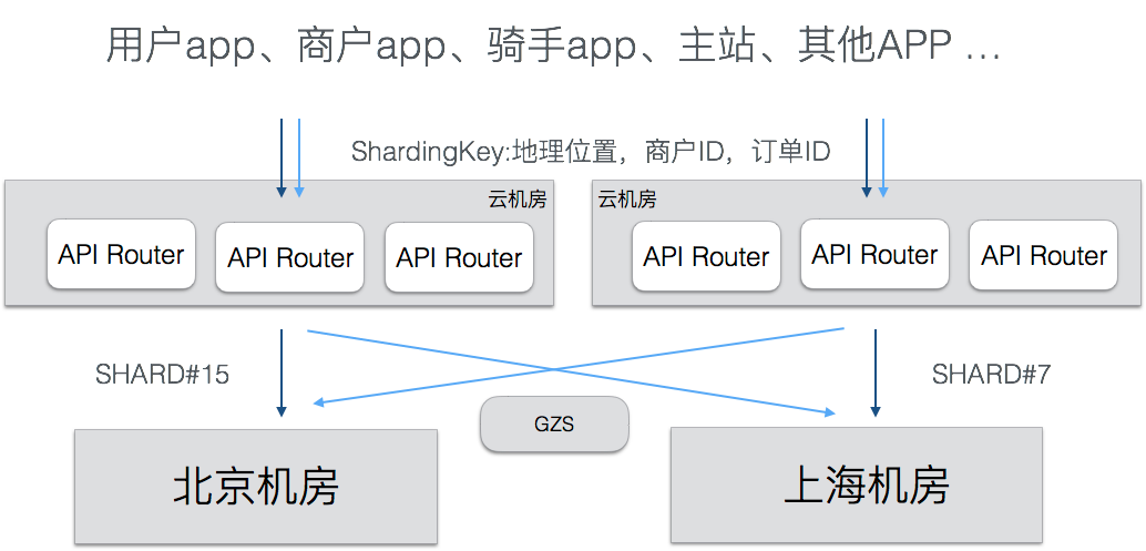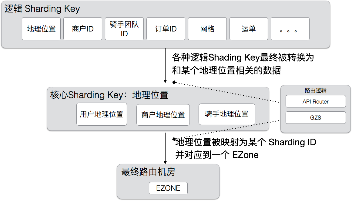 API Router是一个HTTP反向代理和负载均衡器,部署在公有云中作为HTTP API流量的入口,它能识别出流量的归属 shard ,并根据 shard 将流量转发到对应的 ezone。API Router 支持多种路由键,可以是地理位置,也可以是商户ID,订单ID等等,最终由 API Router 映射为统一的 Sharding ID。