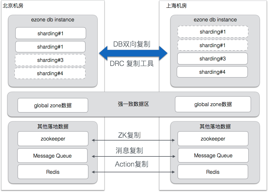 为了实现可用优先原则,所有机房都会有全量数据,这样用户可以随时切换到其他机房,全量数据就需要对数据进行实时复制,我们开发了相应的中间件,对 mysql,zookeeper ,消息队列和 redis 的数据进行复制。