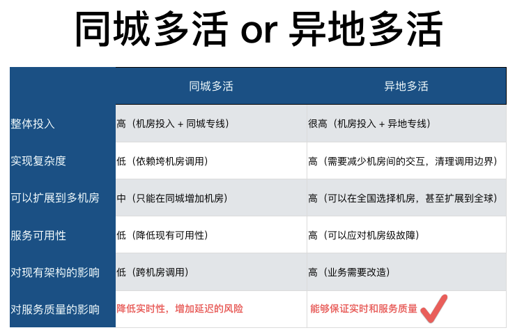 如果机房都在上海,那么网络延迟只有内网速度的2倍,可以当成一个机房使用。所有有些公司的多活方案,会选择同城机房,把同城的几个机房当成一个机房部署,可以在不影响服务架构的情况下扩展出多个机房,不失为一个快速见效的方法。我们在做多活的初期也讨论过同城方案,比如在北京周边建设一个新机房,迁移部分服务到新机房,两个机房专线连接,服务间做跨机房调用。虽然这个方案比较容易,也解决了机房的扩展问题,但是对高可用却没有好处,相反还带来了更高的风险。