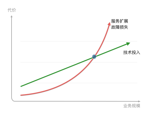 对于一个业务快速增长的企业,每次故障带来的损失也相应是加速增长的,而技术的投入总体上是线性的,初期故障损失小于技术投入,在某个时间点,故障的损失会超过技术投入,这时就要用一些高可用方案,来避免故障,多活就是其中最重要的一种。