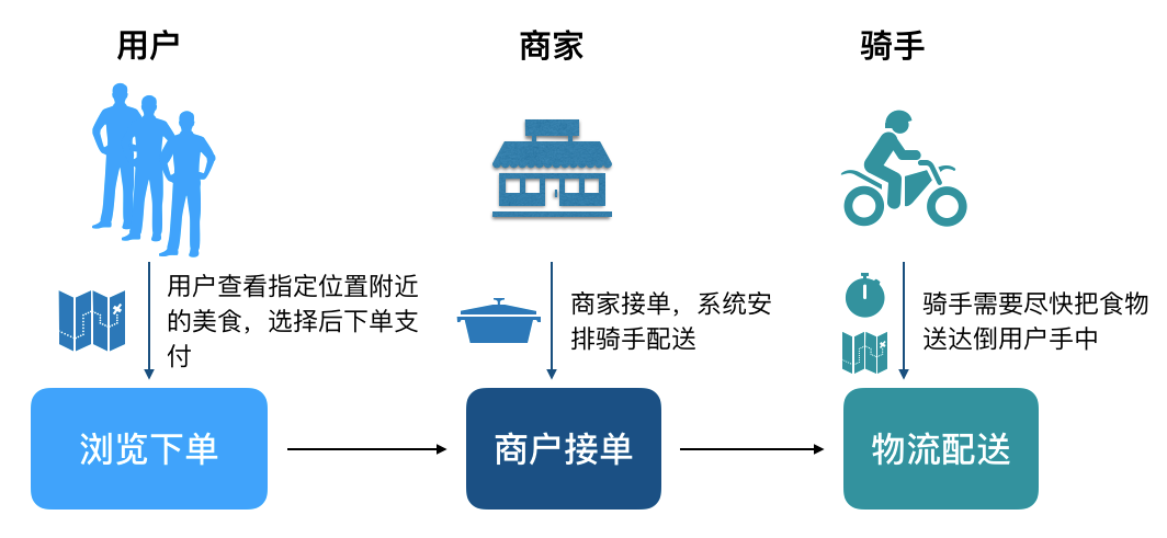 业务过程中包含3个最重要的角色,分别是用户、商家和骑手,一个订单包含3个步骤: