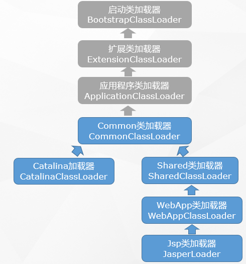 为此,tomcat扩展出了Common类加载器(CommonClassLoader)、Catalina类加载器(CatalinaClassLoader)、Shared类加载器(SharedClassLoader)和WebApp类加载器(WebAppClassLoader),他们分别加载/commons/*、/server/*、/shared/*和/WebApp/WEB-INF/*中的Java类库的逻辑。