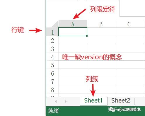 3、它把数据存储在表中,表按“行键,列簇,列限定符和时间版本”的四维坐标系来组织,也就是说如果要唯一定位一个值,需要四个都唯一才行。下面参考Excel来说明一下: