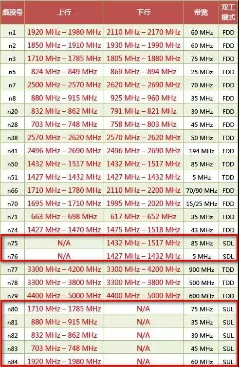 看红色框框这几个频段,既不是FDD(频分双工),也不是TDD(时分双工),而是SDL和SUL。
