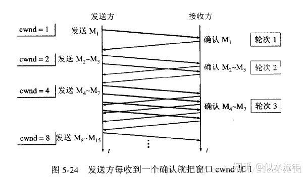 注意,这里的“慢”并不是指cwnd的增长速率慢,而是指在TCP开始发送报文段时先设置cwnd=1,然后逐渐增大,这当然比按照大的cwnd一下子把许多报文段突然注入到网络中要“慢得多”。