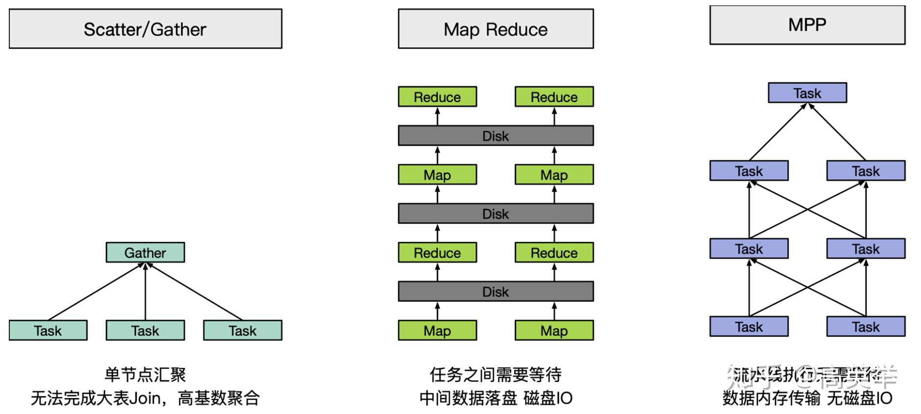 - MPP:MPP学名是大规模并行计算,其实很难给它一个准确的定义。如果说的宽泛一点,Presto、Impala、Doris、Clickhouse、Spark SQL、Flink SQL这些都算。有人说Spark SQL和Flink SQL属于DAG模型,我们思考后认为,DAG并不算一种单独的模型,它只是生成执行计划的一种方式。