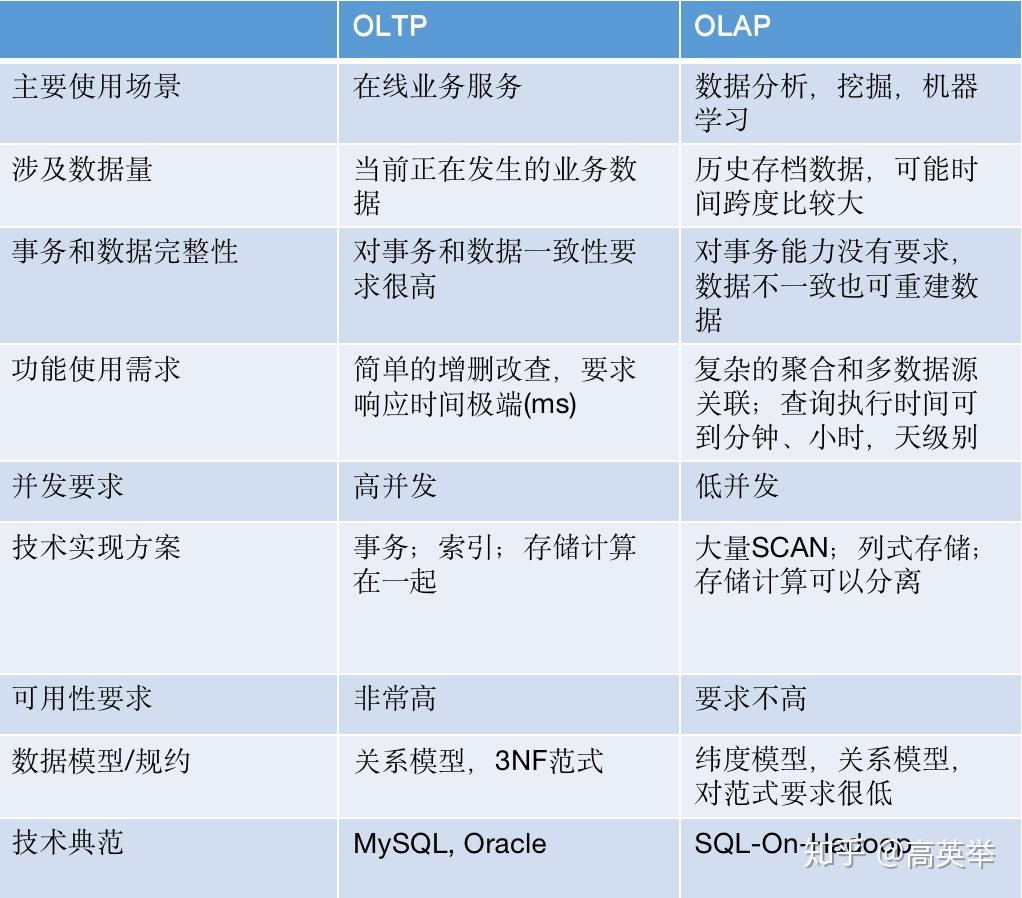 OLAP(On-line Analytical Processing,联机分析处理)是在基于数据仓库多维模型的基础上实现的面向分析的各类操作的集合。可以比较下其与传统的OLTP(On-line Transaction Processing,联机事务处理)的区别来看一下它的特点: