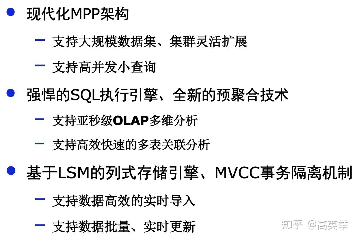 ROLAP 不需要进行数据预处理 ( pre-processing ),因此查询灵活,可扩展性好。这类引擎使用 MPP 架构 ( 与Hadoop相似的大型并行处理架构,可以通过扩大并发来增加计算资源 ),可以高效处理大量数据。