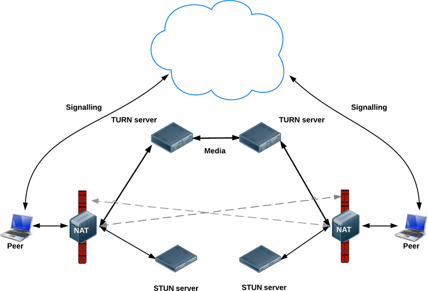 中继NAT实现的穿透(Traversal Using Relays around NAT)就是通过TURN服务器开启连线并转送所有数据,进而绕过Symmetric NAT的限制。你可通过TURN服务器建立连线,再告知所有端点传送封包至该服务器,最后让服务器转送封包给你。这个方法更耗时且更占频宽,因此在没有其他替代方案时才会使用这个方法。