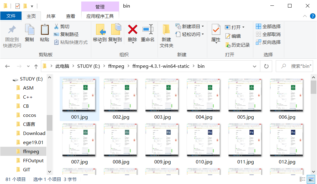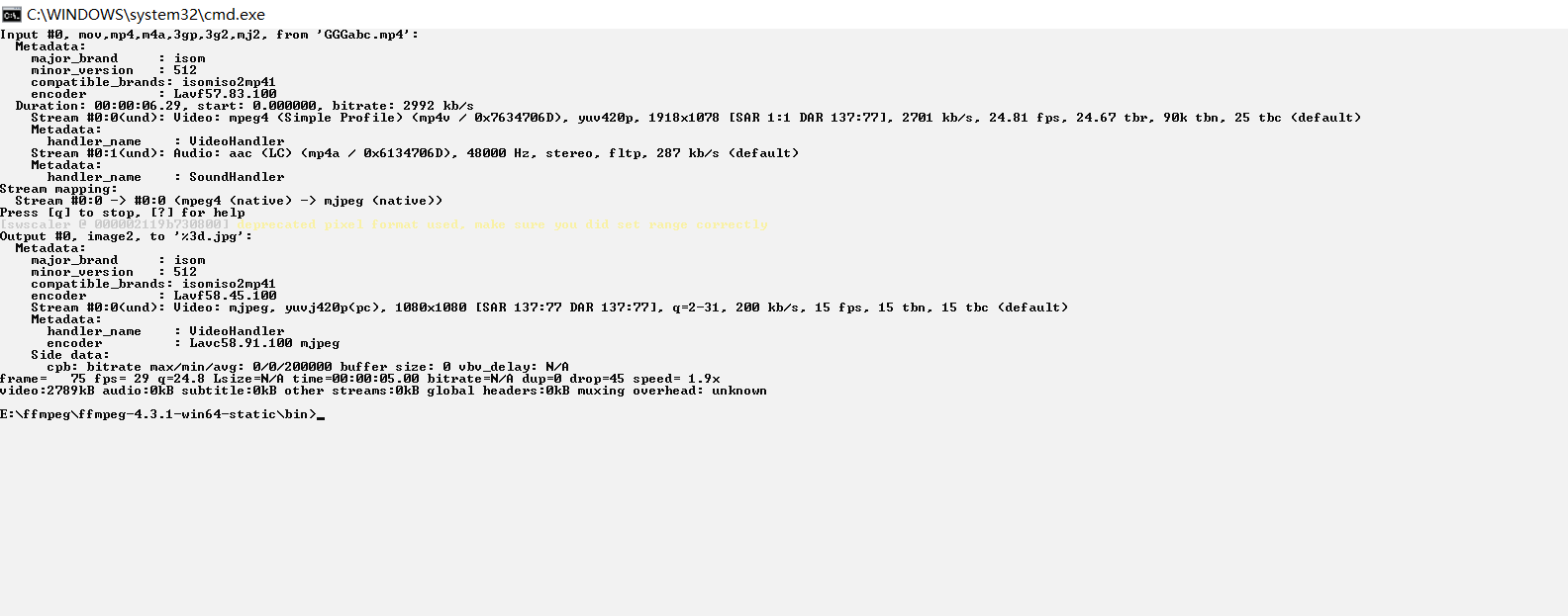 ffmpeg -i GGGabc.mp4 -t 5 -s 1080x1080 -r 15 %3d.jpg 其中-i GGGabc.mp4表示调用bin目录下的GGGabc.mp4视频