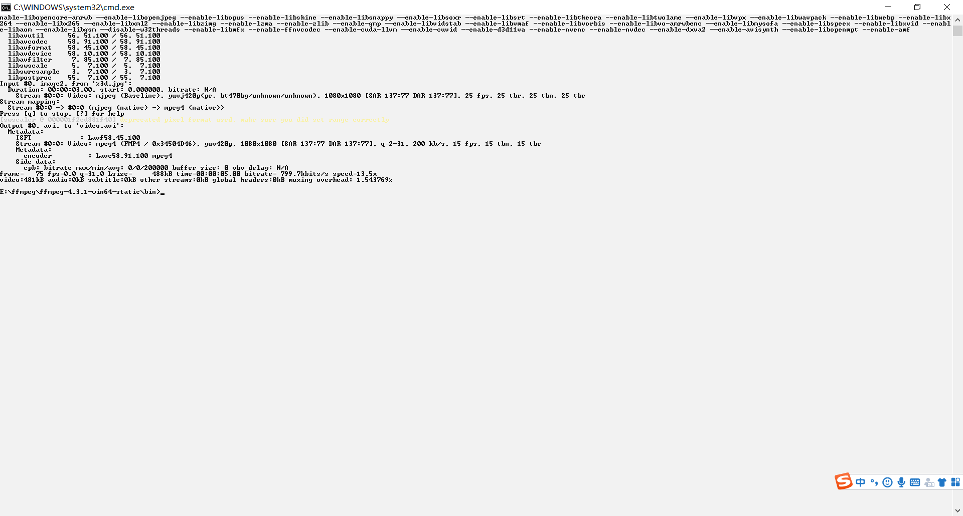 ffmpeg -r 15 -i %3d.jpg video.avi-r 15表示15张图片一秒,就是一秒十五帧