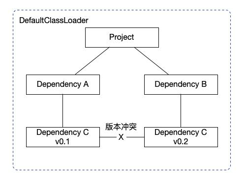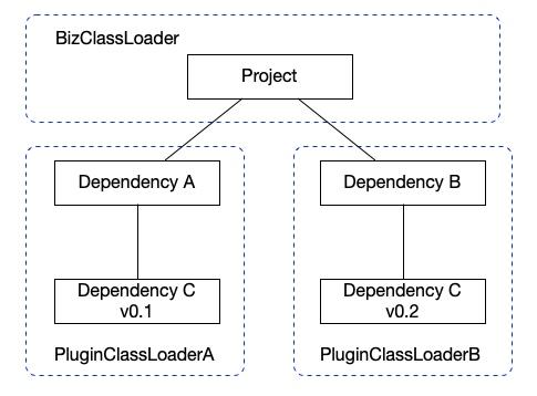 为了避免两难选择,有人就提出了类隔离技术来解决类冲突的问题。类隔离的原理也很简单,就是让每个模块使用独立的类加载器来加载,这样不同模块之间的依赖就不会互相影响。如下图所示,不同的模块用不同的类加载器加载。为什么这样做就能解决类冲突呢?这里用到了 Java 的一个机制:不同类加载器加载的类在 JVM 看来是两个不同的类,因为在 JVM 中一个类的唯一标识是类加载器+类名。通过这种方式我们就能够同时加载 C 的两个不同版本的类,即使它类名是一样的。注意,这里类加载器指的是类加载器的实例,并不是一定要定义两个不同类加载器,例如图中的 PluginClassLoaderA 和 PluginClassLoaderB 可以是同一个类加载器的不同实例。