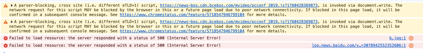 A parser-blocking, cross site (i.e. different eTLD+1) script, https://news-bos.cdn.bcebos.com/mvideo/pcconf_2019.js?1760428369873, is invoked via document.write. The network request for this script MAY be blocked by the browser in this or a future page load due to poor network connectivity. If blocked in this page load, it will be confirmed in a subsequent console message. See https://www.chromestatus.com/feature/5718547946799104 for more details.